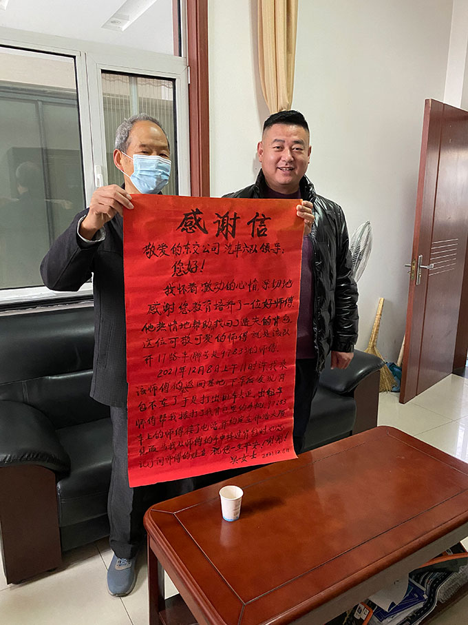 12月9日上午,東營市公交公司汽車六隊的辦公樓里來了兩位手捧大紅色感謝信的老人家。上面寫著“感謝您教育培養(yǎng)了一位好師傅,他熱情地幫助并找回了遺失的背包?!?br/> 原來,在12月8日上午,家住西城的吳女士和老伴從墾利區(qū)返程時乘坐了袁永文師傅駕駛的117路公交車,在到達濟南路附近下車后,發(fā)現(xiàn)自己的隨身斜跨的背包不見了。這時才想到可能是遺落在剛剛的公交車上,“雖然是個小破包,里面也就一百來塊錢,可是手機、鑰匙、老年卡都在包里?!被叵肫甬?dāng)時發(fā)現(xiàn)背包丟失后的吳女士非常著急,“手機還是孩子剛給買的,還新得很呢”。焦急的吳女士便跑到附近的濱海派出所去詢問該如何,“人家給我出了個主意,打上出租車去追”。吳女士和老伴便急忙攔上了一輛出租車去追趕。吳女士說自己老伴平時出門也不帶電話,幸虧出租車駕駛員人也很好,用自己的電話撥打了吳女士背包里的手機。當(dāng)時還在駕駛車輛的袁永文師傅并不知道這一切,當(dāng)他聽到車廂內(nèi)有電話聲響,經(jīng)乘客提醒得知有個背包在座位上,考慮到可能是失主在尋找。袁師傅便在下一站把車??柯愤吅?,從包里拿出電話,撥了回去,這樣雙方才取得了聯(lián)系。