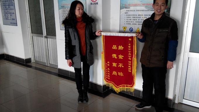 2014年1月23日,乘客王女士拿著一面寫有“拾金不昧,品德高尚”的錦旗來(lái)到市公交公司汽車一隊(duì),感謝車隊(duì)謝明武師傅的高尚品德。