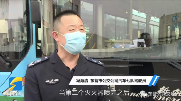 恰巧在這個(gè)時(shí)候,東營(yíng)市公交公司公交車駕駛員馮海清駕駛178路公交車行駛至東營(yíng)市一中站點(diǎn)附近,于是帶著車上的滅火器趕緊上前施救。然而噴完一罐滅火器后,煙依然很大,馮海清便趕忙回到車廂拿了兩罐,當(dāng)?shù)诙€(gè)滅火器噴完之后,火勢(shì)得到有效控制,最終在噴完第三罐滅火器后,徹底把火撲滅了。